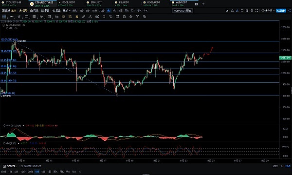 近期比特币和以太币的行情出现了反常情况。快速上涨后,市场开始经历中途的宽幅调整。目前,比特币的压制位大约在37500附近,以太币的压制位在2100一线。这两个价位已经多次被试探,但尚未突破。然而,根据技术面的观察,可以预测今天有很大的概率会突破并站稳在2100的水平上。小时线上,比特币已站上布林带中轨,所有均线都呈多头趋势,MACD指标双线金叉,空头处于缩量状态,KDJ指标走平,整体趋势偏多。建议在比特币现价约为37300附近多单,目标看涨约1000点;以太币在2060附近多单,目标区间为2100至2130。