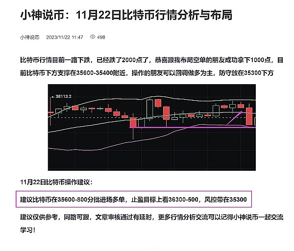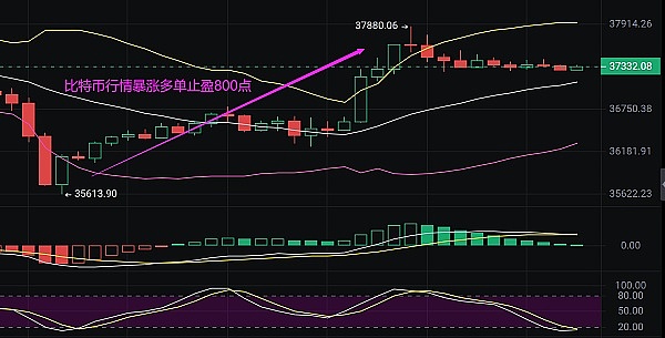 恭喜行情暴涨,11月22日比特币布局的建议btc在35600-35800分批进场的多单完美到达止盈目标36500,恭喜跟上我布局的朋友完美拿下800点利润,大家可以翻阅布局核实:
