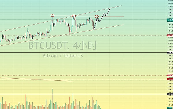 大饼子 这波震荡上行之后应该要突破38000这个位置了,区间洗筹盘整的时间也不短了 目前的 上升通道内走一个楔形,随着etf的现货申请时间越来越近 那么突破的时间也越来越近 !