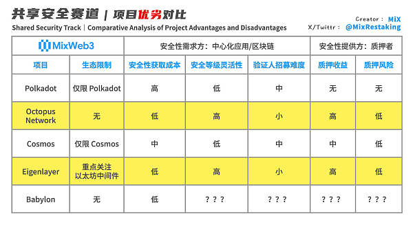 目前,共享安全赛道知名度较高的项目主要是 Polkadot、Octopus Network、Cosmos、EigenLayer 和 Babylon。这些项目的解决方案各有特点,优缺点不能一概而论,应该说都有其对应时代背景和垂直场景。