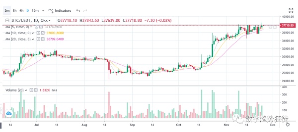 技术面:今日比特币整体走势有所减缓,4H日内开始收拢,日线上升势头也有所减弱,周线没有太大变化,继续处于上升的形态,从盘面走势分析倾向于先盘整修复再上攻的走势,整体中长线K线形态没有太大变化,依旧看涨势头,短期盘整或有小幅回踩的可能。今日上方阻力位38500美元,下方支撑位36900美元。