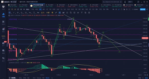 4小时线昨天以太坊跌破下跌趋势线支撑,跌至斐波那契回撤线0.618处才止住跌势反弹,走出大阳线,昨天长路在文中说到过3小时线行情走出了ABC三浪下跌,走出第三浪的延伸浪后反弹,那么可以关注到这波反弹能不能突破到斐波那契回撤线0.382处2045附近的压制,若是不突破,那么将有机会走出第五浪的回踩,若是走出,那么跌破2000点继续要关注到下方上涨趋势线1975附近的支撑,跌破在继续下看。最近行情波动比较大,如果你把握不住行情,经常套单、损单,那么可以关注长路找到长路。