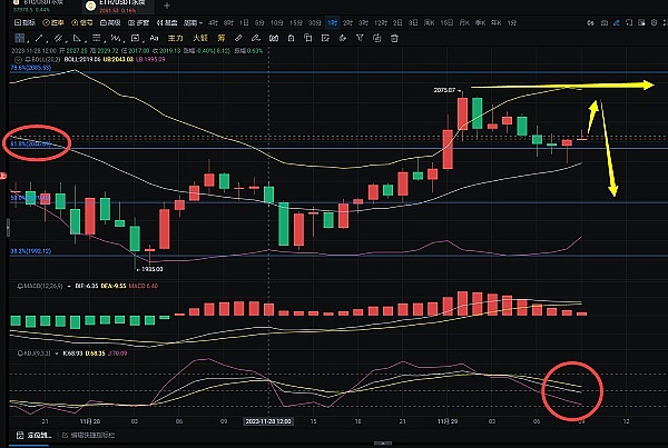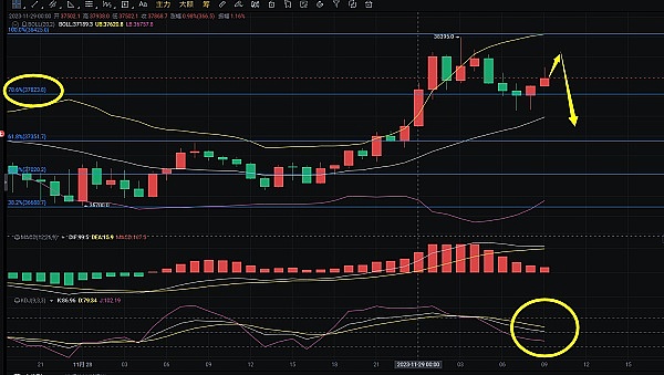 昨天空单止盈后,晚间行情反弹,目前在BOLL中上轨运行,看黄金分割线,小时行情多次突破支撑位,MACD向下拐头有成死叉趋势,KDJ死叉向下运行,结合数据分析,早间操作反弹看空。