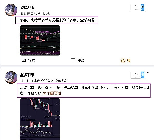 恭喜,昨晚行情暴跌,止跌后金辉果断在比特币在36800-900全网公布布局的多单,行情也是非常配合,早晨如期上涨,完美拿下500多点,恭喜跟上我布局的朋友,多单已全部通知离场,如图: