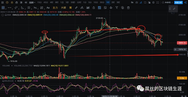 以太,以太坊从4小时线看,有双顶嫌疑,但是目前需要关注的是1950附近一带的支持位置,还有近期的2140的压力位,跟大饼类似,如果站稳2140,就有望可以做低多的单子,目前2180附近一带属于强压力位,暂时不出现很大的行情,很难到达,小时线来看,2140这个位置如果未能成功突破建议还是高空为主,KDJ指标已经失效,因为级别来看,属于下跌通道,未突破之前暂时不考虑这个指标来看,这个时候比较准的是看量能指标,未出现突然放量的情况,短时间内可能很难出现行情反转的行为,我的建议是:未站稳2040,建议高空为主,1950附近一带的支撑可能会出现短期的一个反弹