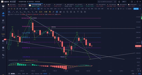 4小时线,行情如长路所图,反弹2077附近走出了4浪反弹,昨天长路在视频和文章中都有提到,只要行反弹不突破2095附近的高点压制,那么就有机会形成5浪回踩,而昨天在视频中还提到若是再次反弹斐波那契0.619处形成M顶,那么将下踩,而受到下方斐波那契数列0.236处的支撑,行情一直位于2025附近震荡,今天操作上仍可继续关注日线中轨的支撑,跌破,那么将有机会去测试2000点附近的支撑,而5浪回踩模型的建立是需要跌破第三浪的低点既1985附近,所以大家可以多关注这个位置,可关注下方1975附近上涨趋势线的支撑,下方就属于谨慎追空的位置了,当然我在这里教的是看盘的方法,如果你把握不住那么就可以找到长路。