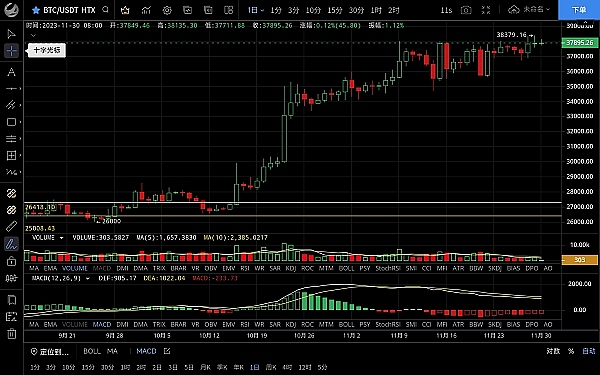 大饼昨日延续多头走势再破前高,最高触及38380一线受阻回落,低位跌至37573一线支撑,目前币价在38110附近运行,四小时级别行情多次试探ma14均线都没跌破,随后再次反弹,重回38000上方,macd多头运行双线金叉向上,ma7均线向上指引,整体来看多头表现强势,短期处于高位震荡,上攻力度不大预计有回踩需求,日线级别行情回踩未破ma7均线走出阴转阳,虽价格上冲但量能未跟,日线持续顶背离,上方空间不大,38800给机会可以试错,以时间换空间,思路建议回踩先多后空,上方压制38500-38800,下方支撑37600-37200