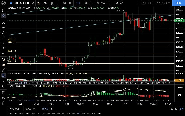 以太坊整体表现不如大饼强势,昨日最高触及2074一线后受阻回落,低位跌至2018一线支撑,目前币价在2036附近运行,四小时级别行情整体受ma30均线压制,多次插针未能有效突破,整体表现弱势,macd无量运行双线粘合,短期行情陷入震荡波动较小,日线级别走势一致,空间逐步变窄,macd呈死叉但量能不足双线死叉,预计还会试探ma30均线支撑,日内还有回踩需求,思路建议回踩后先多后空,上方压制2070-2100,下方支撑2020-2000