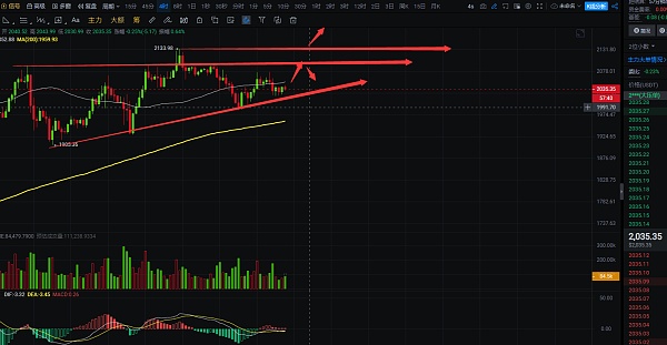 4小时线上看,以太的这波反弹的力度不大,还未到短线压力2105附近,更不说前面2133高点了,昨晚跟着大饼走一波短线回调,目前4小时走势上看还是多头强势,短线压力先看2105附近,到达后再去关注2133破位的情况,以太走势也是需要关注大饼继续拉升突破,目前市场大饼拉升有力度,以太的反弹力度弱一点,只有大饼涨的差不多了以太才会有补涨的机会,日内以太依旧是看好反弹,日内支撑2020附近,这波短线的回调也是到达2020附近后收几根下影线,没有去继续下跌,只要下方不破1984位置,多单都没啥问题,自行把握进场机会;短线交易,控制风险,盈亏自理;