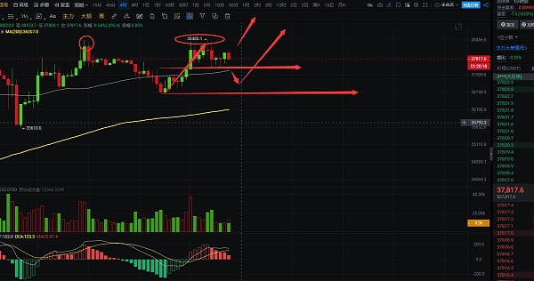 4小时线上看,大饼昨日价格居高不下,破前高后没有延续拉升,给到小幅下跌,经过一晚上震荡,大饼4小时一直在试探37600附近没有去跌破,并几次收下影线,日内该位置就能视为短线的支撑,虽然走了小回调,但多头还是强势,后市拉升往39500去还是没啥问题,只是需要一点时间,日内短线不破36709位置,多单都是安全的,日内需要关注的点位是37600短线支撑,跌破看37100附近,反弹只要开始,就不会再是虚晃一枪了,就要往39500附近去走了,自行把握进场机会;短线交易,控制风险,盈亏自理;