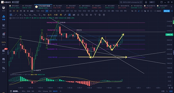 今天是12月的第一天,上月月线收大阳线,受到上方月线上轨的压制,RSI有稍稍转头的趋势,但是MACD有形成金叉的趋势。需要注意可能会冲击月线上轨的压制。昨天以太坊收出阳性,刚刚一波比较大的拉伸,突破下方2077附近的压制,但未突破上方2095附近高点。从技术面上看,行情跌至日线中轨附近并未跌破获得支撑反弹,技术指标有向上的趋势。今天需要关注会不会突破2095的压制,涨至2125附近。