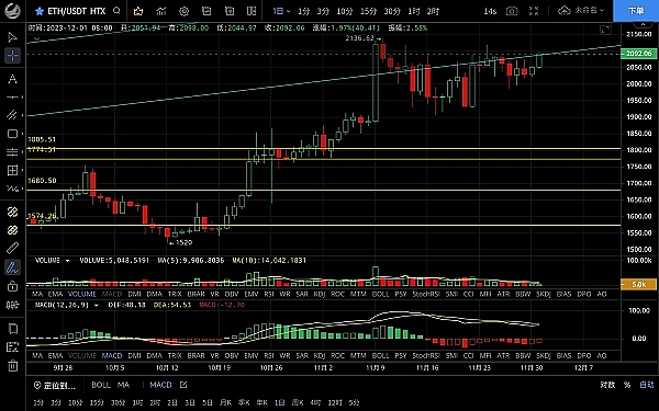 以太坊昨日走势与思路一致,低位跌至2021一线后支撑反弹,行情震荡上行,早间多头加速拉升至2089一线受阻回落,恭喜跟上昨日思路的朋友多单获利70点,目前币价在2086附近运行,四小时级别ma7均线上穿多根均线形成金叉,macd多头放量双线金叉向上,k线收大阳,日内多头走势较强,短期还有上冲需求,切勿着急进空,日线级别连续在高位收十字星,结构上有变盘迹象,上行突破前高的概率较大,目前高位不适合入场,昨日多单继续持有,空单在触及阻力位时再介入,上方压制2120-2150,下方支撑2070-2040