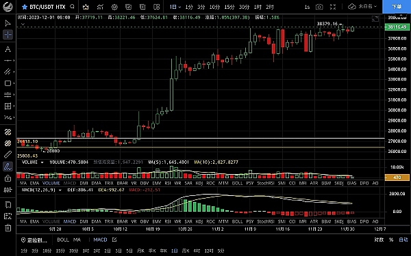 大饼昨日白盘呈下行走势,低位跌至37467一线支撑反弹,高位触及38066一线受阻,恭喜跟上昨日思路的朋友多单获利400点,目前币价在37970附近运行,四小时级别行情多次回踩ma30都未曾跌破,价格再次回到38000上方,可见支撑力度较强,macd空头缩量双线拐头向上有金叉迹象,短期来看多头依然强势,有试探前高的需求,多单可继续持有,日线级别k线虽收阴但下跌力度不强,整体仍在ma7均线上方运行,随时上攻的可能,思路与昨日一致,空单不着急入场,上方压制38500-38800,下方支撑37600-37200