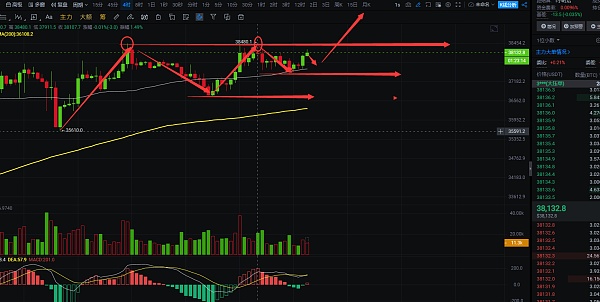 4小时线上看,大饼从走势上看是多头更强一点,前面到达38436后下跌是需要到36200附近才能算回调到位,但是最高只到36700附近后就开始拉升,后面的拉升虽然只是小破了一下,但足以能够说明大饼多头强势,虽然短线走出小幅回调,后面的这波回调如果回调到37100附近,那拉升还有可能放缓,但大饼短线支撑到达37600附近后就开始拉升,又能说明多头的强势,现在12月份了,距离ETF审核通过的时间也越来越短了,市场已经为ETF通过做好了准备,这无疑又能带动市场走一波反弹,不管是短线还是中长来说,大饼都是多头强势,日内短线上,大饼很大几率会突破38480往39000上方去,日内关注支撑点位在37600附近,如站稳38300,那可追进去,目标就是39500附近,自行把握进场机会;短线交易,控制风险,盈亏自理;