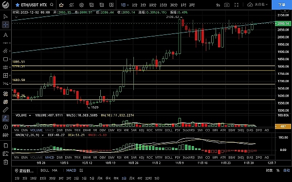 以太坊昨日直线拉升后延续多头走势最高触及2109线受阻回落,低位跌至2060一线支撑,恭喜跟上昨日思路的朋友空单获利40点,目前币价在2095附近运行,四小时级别行情整体处于均线上方运行,macd多头减弱双线金叉向上,短期走势处于高位震荡,短期压力在2100区域,若能站稳2100上方则有机会冲新高,日线级别形成k线双顶,macd空头逐步缩量,冲不破2100则会先走回落,下方关注2070支撑情况,思路建议高空为主低多为辅,上方压制2120-2140,下方支撑2070-2040