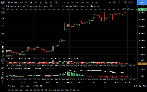 大饼昨日一路上行触及38800一线受阻迅速回落,低位跌至38000附近支撑反弹,恭喜跟上昨日思路的朋友空单获利800点,目前币价在38770附近运行,四小时级别行情向下插针但未破ma7均线,随后再次反弹突破前高,整体处于ma7均线上方运行,盘面来看多头表现较为强势,但macd量能不足双线金叉状态,短期来看行情处于高位震荡,日线级别来看行情整体呈碎步上行走势,macd空头转多双线有金叉迹象,呈持续顶背离结构,上方空间不大,建议逐步进空拿中线,上方压制39000-39500,下方支撑38300-38000