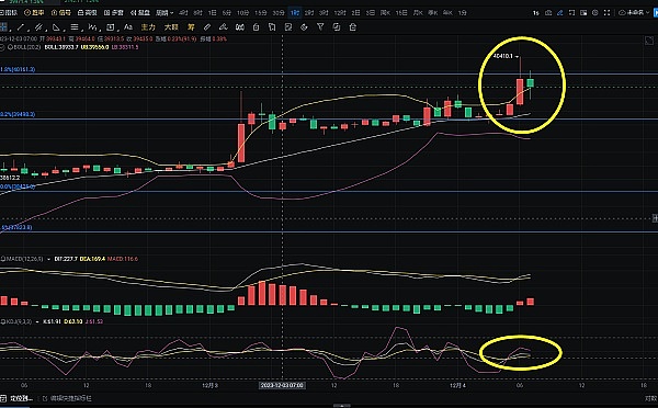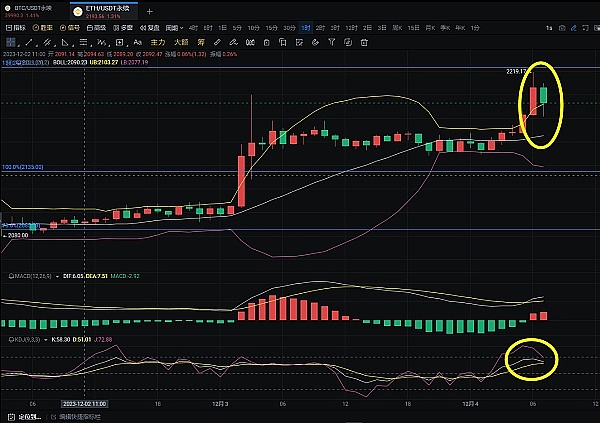 昨天震荡一天的行情在凌晨突然拉升,以太坊破2200,比特币破40000,实盘操作已经盈利出局,目前行情在BOLL轨道上方破轨运行,MACD形成死叉,KDJ运行在超买区上方有拐头向下趋势,结合数据分析,早间操作建议先高位看空,再回踩做多。