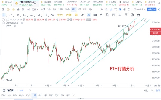 以太币突破2200点,打破了年内的新高,证明了其明显的上涨趋势,也标志着小牛市的到来。早间价格试探低点在2180附近,也就是小时线布林带下轨的位置。投资者可以考虑在这个区域进行多单操作,并且设定目标在2220—2250之间。