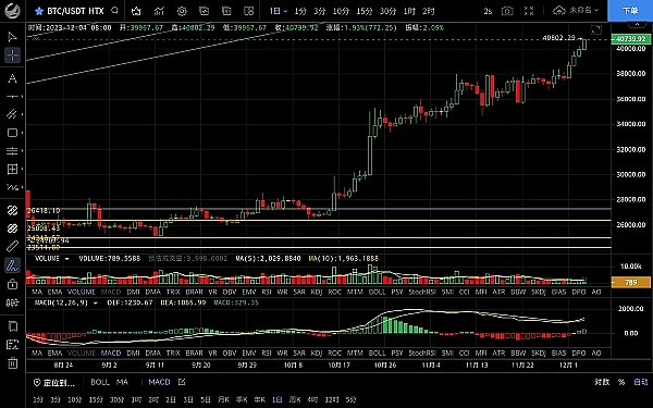 比特币昨日经过横盘震荡后再次向上突破了4万美元大关,并触及了40800一线,但遇阻回落。跟随了我们思路的朋友在多单中赚取了3000点的利润,反手做空的朋友也在盈利中。目前币价在40700附近运行,四小时级别的MACD指标逐步放量,双线呈金叉状态,均线也在向上指引,整体上看多头表现强势,走出了单边趋势。当前行情处于高位,追多并不可取。同时,上方临近压力,空单可以继续持有。日线级别的走势与之前没有太大变化,仍然是单边上涨走势。如果能够稳定站稳4万美元关口,比特币很可能会继续上行,回踩不破39200的话也可以考虑进一步加仓。下方关键支撑位置在38700区域,虽然跌破的概率较小,但也需要注意。我的建议是,回踩时以低位加仓多单为主,高位持有空单为辅。上方的压力区间在40800-41500,下方的支撑区间在40000-39200。
