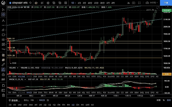 以太坊的走势与比特币相似,昨日价格也经历了下跌后的反弹,突破新高至2230附近受阻。跟随了我们昨日的思路,多空双向操作的朋友均获得了利润。目前币价在2215附近运行,四小时级别的行情沿着MA7均线上涨,走出了单边趋势。短期K线连续收出上影线,说明价格已接近阻力区域,如果不能突破前高,预计会有一波回踩。激进的投资者可以先小仓位做空。日线级别的MACD指标由空头转多,双线呈金叉状态,K线连续收阳,多头表现较为强势。从走势来看,回调做多是比较明显的策略。我的建议是,低位多单为主,高位持有空单为辅。上方的压力区间在2230-2280,下方的支撑区间在2200-2150。