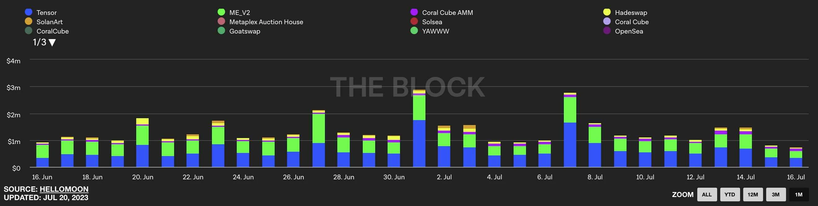 Tensor是一个专业的基于Solana的NFT交易平台,提供快速数据处理、批量操作和高级订单类型等功能。最近一个月数据显示,Tensor超过了老牌王者Magic Eden,成为Solana NFT市场的领头羊。