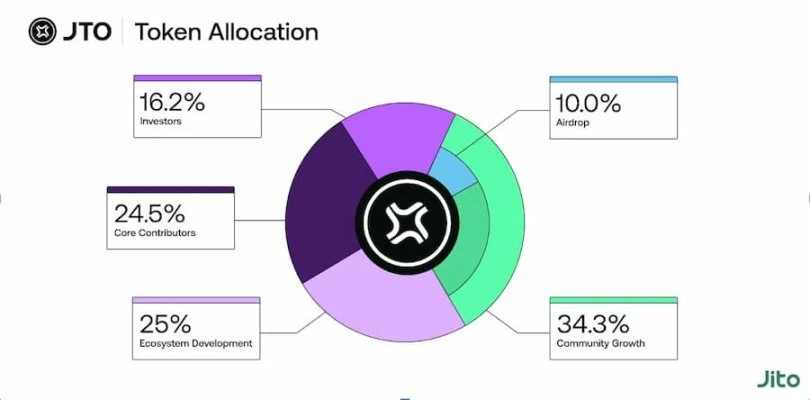 代币经济学方面,JTO 总供应量为 10 亿枚,其中 10% 将用来空投, 24.3% 将由代币持有者通过 Realms 上的 DAO 治理直接控制, 25% 用作生态系统发展, 16.2% 分配给投资方(1 年完全锁定,三年内全部解锁), 24.5% 分配给核心贡献者,即Jito 的创始人以及生态系统早期贡献者的员工(1 年完全锁定,三年内全部解锁)。