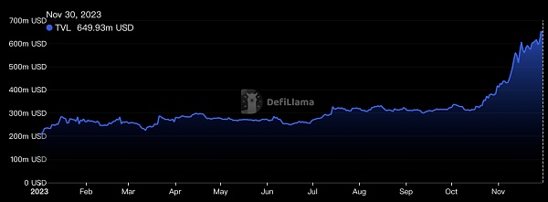 自2023年初以来,Solana的总价值锁定(TVL)呈现显著增长,现已达到650M,涨幅超过200%。