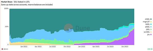 最近上线的Jito质押服务,自去年11月底推出以来,已累计超过$44.86M(2.3M SOL)的TVL。跨流动质押衍生品(LSD)和DeFi用例的增长也很显著。