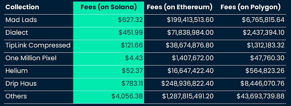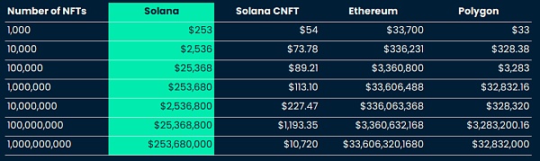 例如,Solana上铸造100万个NFT的成本,使用状态压缩前后分别为253,000美元和113美元。而在以太坊和Polygon上,相同数量的NFT铸造成本分别为3360万美元和3280万美元。