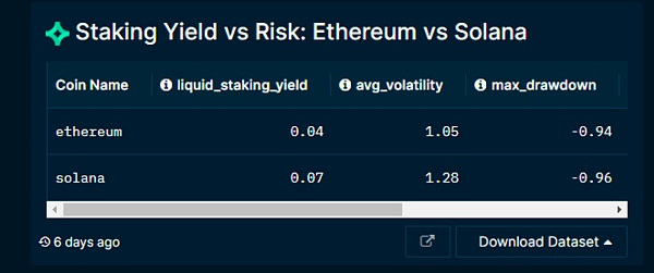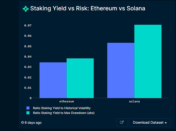 风险与收益的对比:在接近的风险水平下,Solana的质押回报几乎是以太坊的两倍。
