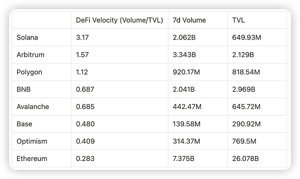 在最近一周内,Solana的7d DeFi Velocity比率达到3.17。这意味着,每1美元的流动性能够产生约3.17美元的周交易量。与Arbitrum、Binance、Base、Optimism和Ethereum等其他链相比,Solana在过去7天内展现出最高的TVL利用率。