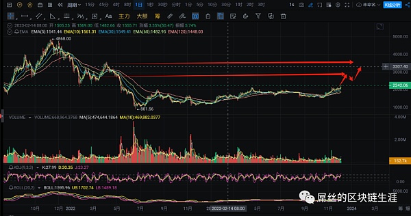 以太,ETH从周线看,也是属于多头趋势,但是相比于BTC来看,好像要差那么点意思,可能现在像ustc ordi,lunc吸引了比较多的资金过去,ETH站稳2150,上方的压力位就已经突破,如果从大级别看,以太坊的压力位在3000附近,4小时看,目前2150附近一带出现了一定的放量,这是多头有力并且有效的放量,2150附近一带的支撑就显得更加硬一点,小时线看,均线偏离币价比较大,但是目前还没有看到放量启动,我个人认为后面以太坊可能会补涨一波,我的建议是:多单可继续拿着,如果有回调2180附近可以加仓,上涨高度我看到3000附近。