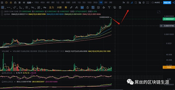 lunc,这个币现在无论从周线还是日线看,都是非常强劲的,一路破近期新高,走势也是稳步向前,但是值得注意的是币价目前脱离MA30均线较远,后期价格会持续向ma30均线靠拢,要么时间修复,要么价格下来,但是做空我还是不推荐,因为目前来看,整个市场都是多头,很难出现大的回调,我的建议:回踩0.0002附近可以上点多单,上方暂无压力位,0.0002是短期的一个支撑。