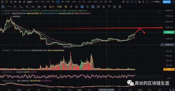 大饼,BTC从38000一带一路上涨到41000附近,从周线来看,多头趋势依然在延续,很多人不敢追涨,怕回调,其实这都是对市场认知不够的行为,我上次文章中说到突破38500是完全可以追涨,且那天出现了很明显的放量且站稳实体阳线上涨,所以操作上依然是低多为主。4小时来看,kdj跟RSI已经出现失效作用,原因也很简单,震荡区间已经打破,现在属于上涨通道,并且未看到有很明显的多空争夺阵地的局面,小时线看,也是上涨通道,所以我的建议是,41000一带也可以上点多单,40000可以补仓多单,我个人目前这波上涨看47000一带。这个位置是前压力位,到时候再看后面走势。