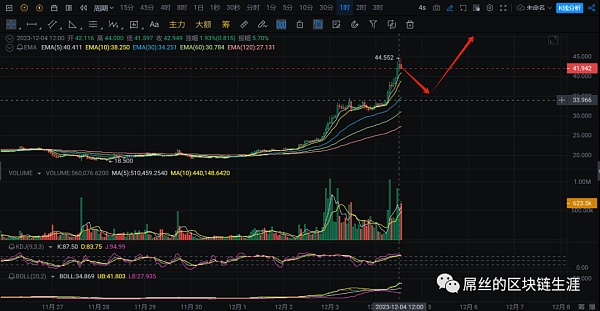 ordi,这个币我之前也一直在关注,首先要恭喜凡总,恭喜核心群跟上吃肉的朋友,从21附近凡总就提示大家进场,到现在已经接近45了,现货都直接在短暂的几天内达到翻倍,合约拿住的都基本上赚了很多了,从日线来看,三根大阳线,属于典型的三步虎走势,但是量能有所下调,这里我需要跟大家说一下的是,价格上涨的时候,量在持续的缩减,这说明追涨的人动力不足,或者地位拿住了的人,也没有在这个地方卖点,后续密切关注日线裸K,出现十字星或者上影线的时候就需要注意上涨的滞涨,或者说回调的可能了,小时线看,可能存在一定的回踩,但是切不可去吃空单,原因很简单,小级别的回踩是不影响大趋势的走势的,我的建议是,37-38之间可以上低多,上方区间有多大,我目前还没看出来,低多的策略是最安全,且是最保险的。