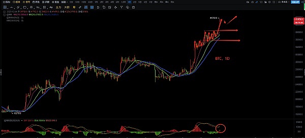 1D,大周期持续加强趋势,MACD指标再次零轴上金叉,动能柱转多头放量,行情上破,新高。整体保持多看不变,日内建议低多。尽量不要逆势空单。前高38500以及整数关口的40000,都可作为下方强支撑关口,不破不空。
