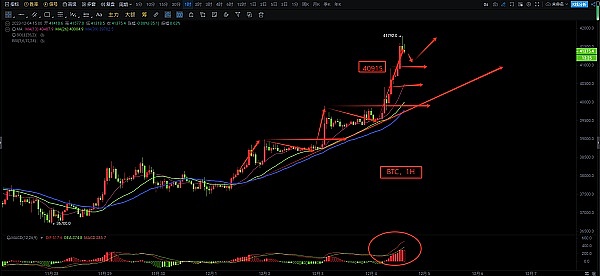 1H,超短线行情中,出现调整需求,收一小时级别滞涨阴线,整体方向多,建议前高上方激进低多为主,点位40915附近,小止损轻仓尝试。目标前高,甚至再次新高。