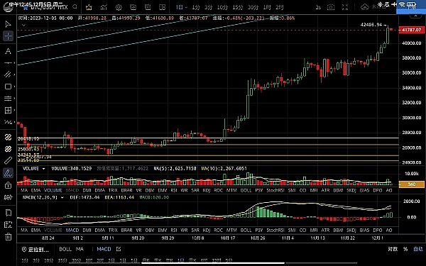 大饼昨日延续多头走势高位触及42110一线受阻回落,低位跌至41130一线支撑,行情再次反弹破位新高至42400一线,目前币价在41760附近运行,四小时级别行情沿ma7均线一路上行,期间虽有回踩但力度不大,未曾跌破过ma7均线,多头表现较为强势,走出单边趋势,目前k线收十字星,虽破位前高但量能未跟,形成短期顶背离结构,预计会走一波回踩,日线级别k线收上影线,可见行情到达阻力区域,macd多头逐步放量双线金叉状态,短期虽滞涨但多头趋势依然强势,思路建议回踩低多为主高空为辅,上方压制42500-43200,下方支撑41200-40800