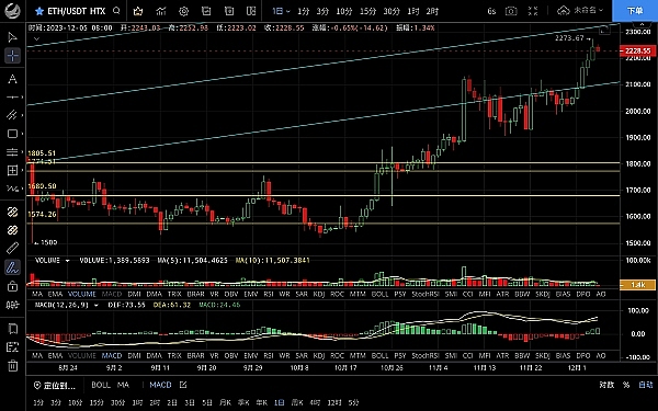 以太坊昨日走势呈一路上行,最高触及2273一线受阻回落,低位跌至2202一线支撑,恭喜跟上昨日思路的朋友多单获利50点,目前币价在2230附近运行,四小时级别行情二次反弹未破前高短期到达阻力区域走出回落,k线跌破ma7均线,macd多头逐步缩量双线拐头向下有死叉迹象,短期走势还有回踩空间,日内突破新高的概率不大,激进可以先空,下方不破2200依旧可以短多,日线级别仍是多头走势,但目前处于高位不建议追多,关注回踩力度低多为主高空为辅,上方压制2250-2280,下方支撑2200-2150