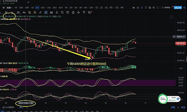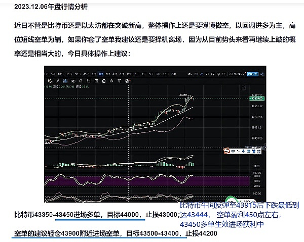 今日午间给到比特币操作策略 ,43900进空,目标43500-43400,行情如期而至反弹43915后下跌最低到达43444,到达目标区间内,盈利450点,43450多单也同时生效持续获利中,记录如下: