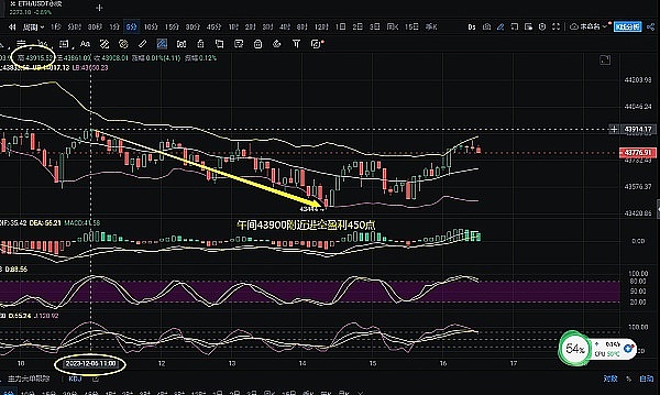 今日午间给到比特币操作策略 ,43900进空,目标43500-43400,行情如期而至反弹43915后下跌最低到达43444,到达目标区间内,盈利450点,43450多单也同时生效持续获利中,记录如下: