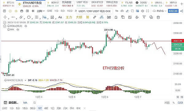 最近几个交易日,比特币和以太坊的价格都呈现多日阳线的走势,短期涨幅较大,已有不少获利盘出现。此刻多空观点开始分歧,市场将以震荡为主的局面。比特币的最高点位于44500附近,昨天价格基本处于横盘整理的状态,并未突破向新高的位置。四小时布林带上轨正在逐步向下压制,白盘看好回踩中轨附近的支撑点,建议在44000附近进行空头操作,目标看向43000、42500和42000。而以太坊的四小时价格已经破位中轨,布林带的上下轨口逐渐缩小,压力位在2250至2260附近。只要小时线中轨无法站稳,趋势仍然是看跌的,建议在2250至2260附近进行空头操作,目标看向2180和2150。