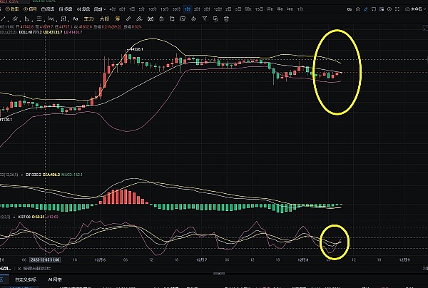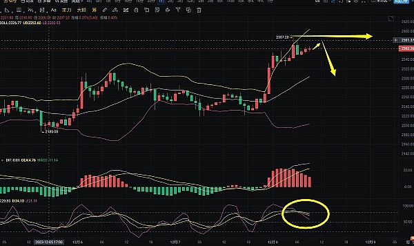目前行情处于震荡,BOLL轨道张口运行,MACD并行,KDJ形成死叉下行,结合数据分析,行情还有上涨的空间,但是上轨压力位较强,操作上还是建议高位看空。