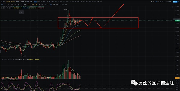 首先恭喜那些跟上核心群操作的朋友,这波行情抓住了利润。目前从小时间周期来看,价格突破0.5后回落到0.49附近,无论是大周期还是小周期,都意味着突破之前的0.5已成为压力位。然而,目前看起来好像还没有有效站稳,前方的0.55将成为压力位,今天没有试探这个位置的迹象,可能还会出现一定的回撤后再度启动的走势。我的建议是,如果仓位较重,可以适当减仓,补仓位在0.46-0.47之间,如果晚上修复形态并突破0.52的话,那么这将是我们把握的关键点位,再次尝试0.52将很有可能突破新高。由于目前情况不明朗,建议适当减仓,以避免再次出现洗盘的情况。目标依然看向0.65。