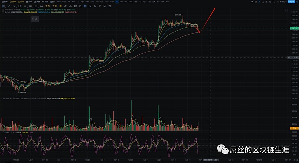 以太坊(ETH)当前回调至2330美元附近。在4小时级别上,出现了两根实体阴线,但下降的量能不足,因此回升修复上行的速度非常快。MA30均线的支撑位2300美元尚未到达,我认为这是一个不错的支撑位置。在小时线上,价格已经跌破震荡区间,正试图接近2300美元,KDJ指标显示转头向下,并且J指标已经下跌至20以下,整体盘面表现较弱。我的建议是低多,2300美元附近可以进场多单,2250美元附近可以尝试补仓。多头趋势并没有被打破,良好的回调和适度的量能表明价格不太可能继续下跌。
