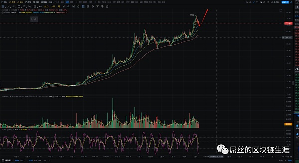 SOL近期表现引起了广泛关注,行情也非常不错。从周线级别来看,形成了一个标准的弧形底,周线级别的压力位于140美元附近。在日线级别上,价格偏离均线位置较远,短暂的日线级别回调也是非常正常的。整体形态良好,属于上涨通道开启的趋势。在4小时级别上,之前价格多次位于MA120均线上方,并且价格从未跌破该均线,可见MA120均线是区分SOL多头和空头的关键指标。目前MA120均线位置位于62美元附近。因此,我的建议是只要价格没有跌破62美元,可以继续看多。MA30均线70美元附近可以进行低多,整体看多头趋势。目标看向140美元。