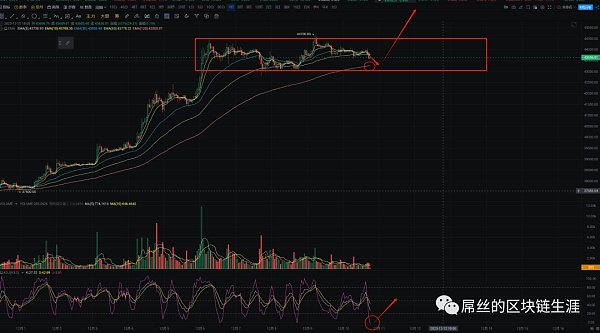 比特币(BTC)的行情今天出现震荡下跌,当前价格约为43700美元。从整体盘面来看,属于震荡行情。在4小时级别上,价格已经跌破布林带中轨,KDJ指标显示底背离的状态,整体行情处于震荡为主的趋势。预计震荡区间将在43000-44100美元附近。MACD指标显示红色实体动能缩量,目前需要关注MA30均线43250美元附近的支撑位。在小时线上,MA120均线已经上移到43200美元附近。因此,整体思路仍然是看多,建议在43250美元附近尝试多单,43000美元加仓。当前行情仅为震荡修复均线和量能萎缩,可能即将出现变盘的时机。