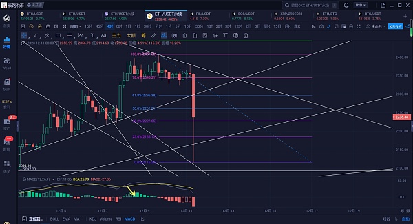 尽管在之前的文章中已经提醒了行情反弹上方要关注日线斐波那契回撤线0.382处2420附近的压制,并给出了不追多的信号,但行情仍然出现了一波大跌,直接跌至2120附近,行情急速下跌。
