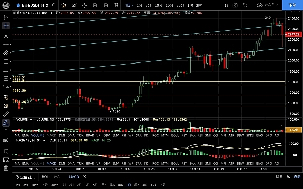 以太坊昨日白盘波动不大,晚间行情碎步上行最高触及2377一线受阻,行情迅速回落,最低至2127一线支撑,目前币价在2240附近运行,四小时级别k线收在ma60上方,但未能继续走反弹,macd放量运行双线死叉向下,短期来看空头表现强势,目前没有介入机会,等待行情反弹,日线及周线来看k线大阴回落吞没前期涨幅,可见力度较强,走势如思路一致,文中提示过切勿追多有回调风险,2400高空也获利不少,主流不好介入关注其他独立走势币种有机会介入,日内思路建议反弹高空为主低多为辅,上方压制2270-2300,下方支撑2230-2200