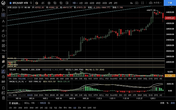 大饼昨日波动不大,最高触及44033一线受阻回落,但回踩空间不大,一直呈横盘走势,凌晨空头发力连阴下跌,低位至40413一线支撑反弹,目前币价在42233附近运行,四小时级别macd空头放量k线大阴回落,跌至ma90支撑收针反弹,ma7均线拐头向下,副图指标延续死叉状态,整体走出一波四小时顶背离回落,目前关注ma60支撑情况,破位预计还有二次下探的可能,日线级别多头逐步缩量双线拐头向下有死叉迹象,短期多头暂时告一段落,整体有回调需求,下看40000-38000区域然后盘整再反弹上行,日内思路建议反弹高空为主低多为辅,上方压制42500-43000,下方支撑41600-41000